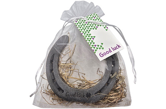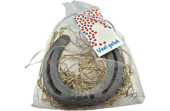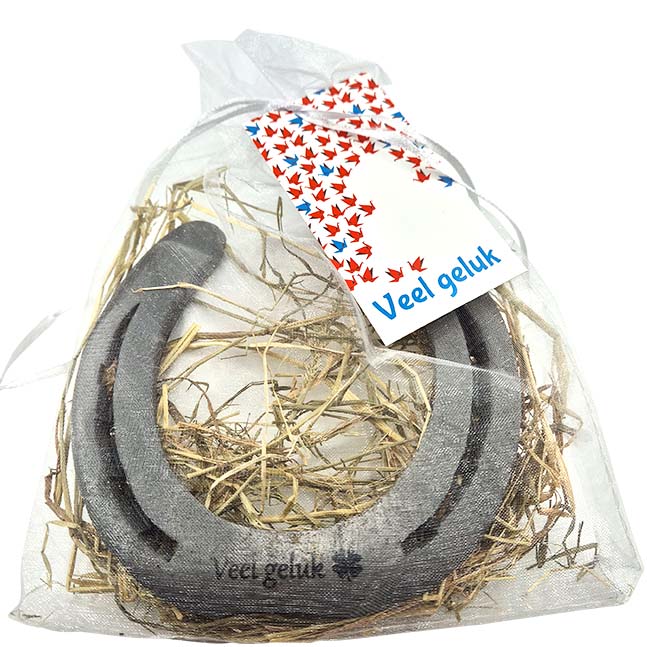 Inhoud: het hoefijzer wordt geleverd in een organzazak met stro en een kaartje om een persoonlijke boodschap op te schrijven