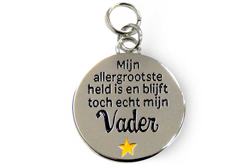 Op de charm staat de tekst "Mijn allergrootste held is en blijft toch echt mijn Vader"