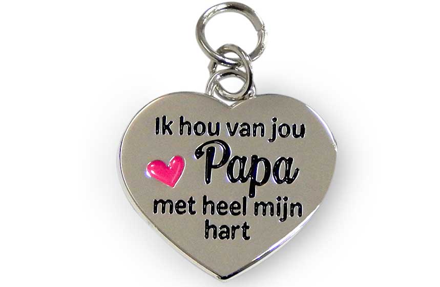 Op de charm staat de tekst "Ik hou van jou Papa met heel mijn hart"