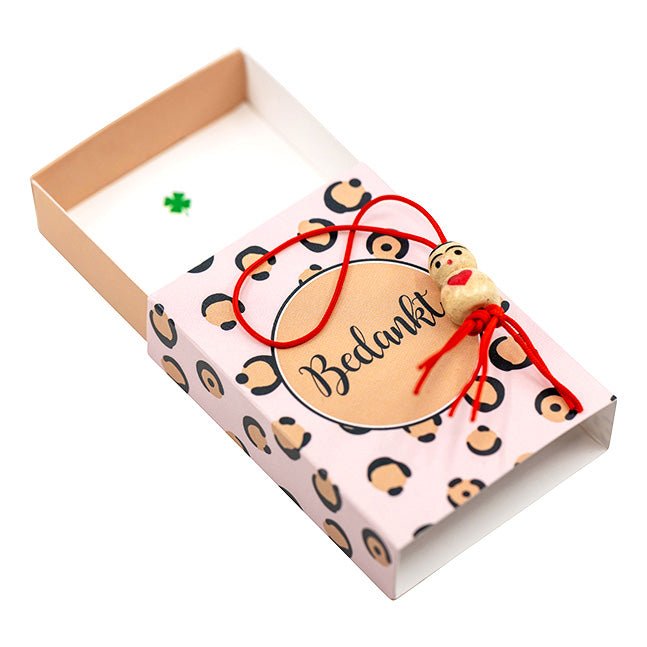 - Inhoud: doosje met gelukspoppetje en briefje voor persoonlijke boodschap
