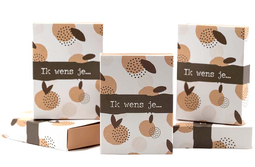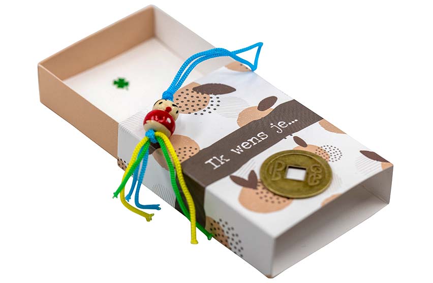 - Inhoud: doosje met gelukspoppetje, geluksmuntje en briefje voor persoonlijke boodschap