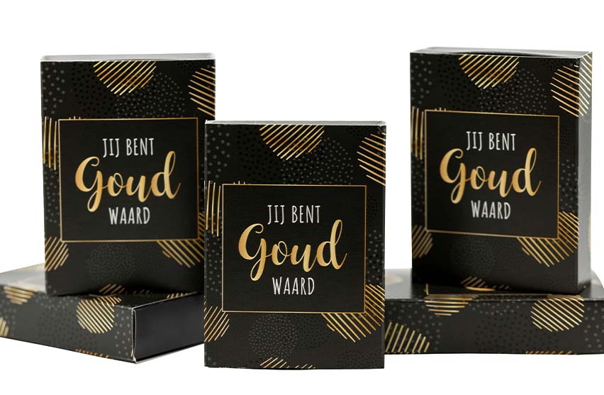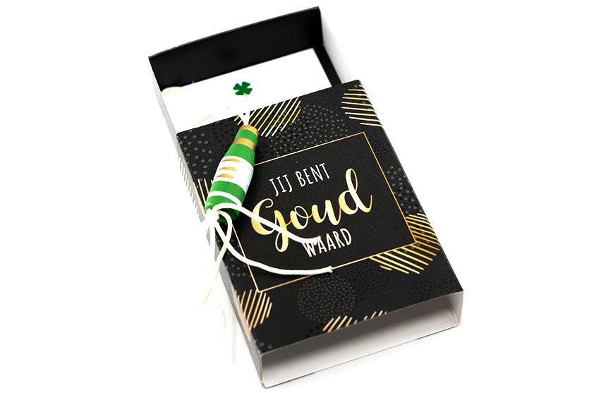 Leuke kleine attentie om weg te geven aan iemand of aan meerdere personen. In het doosje Jij bent Goud waard zit een geluksflesje Champagne* en een briefje om een persoonlijke tekst op te kunnen schrijven. Aan de bovenzijde van het briefje staat een groen klavertje vier voor geluk afgebeeld.