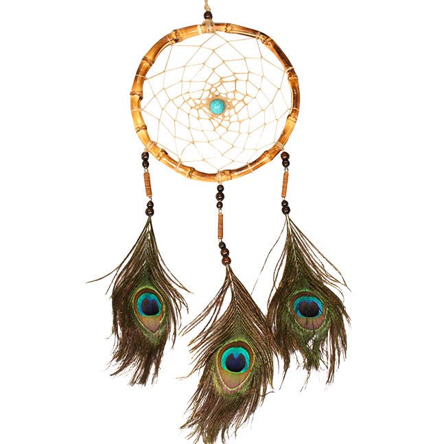 Deze mooie decoratieve dromenvanger is gemaakt van bamboe en heeft echte pauwenveren. Een dromenvanger boven een bed vangt de nare dromen zodat alleen de leuke dromen worden gedroomd.