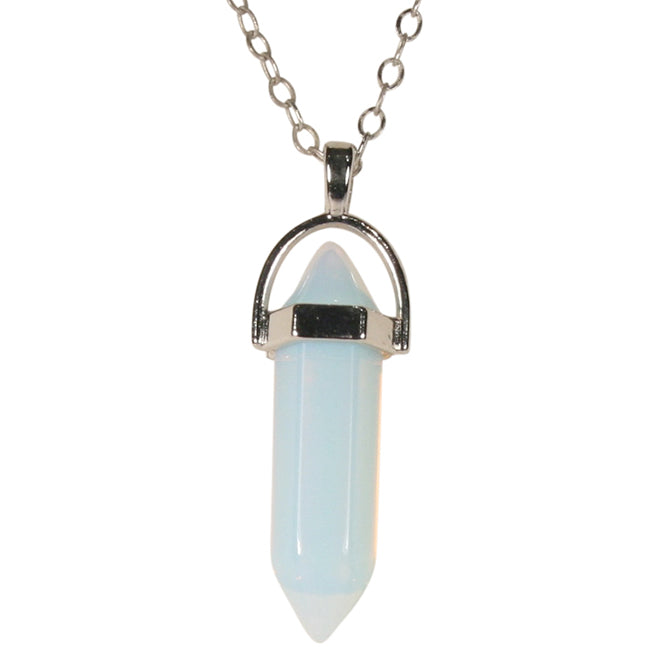 Dubbeleinder hanger van de edelsteen Opaal in een zilverkleurige houder. De punten aan weerszijden (dubbeleinder) zorgen er voor dat de energie en de werking van de steen aan beide kanten wordt verspreid en/of ontvangen.