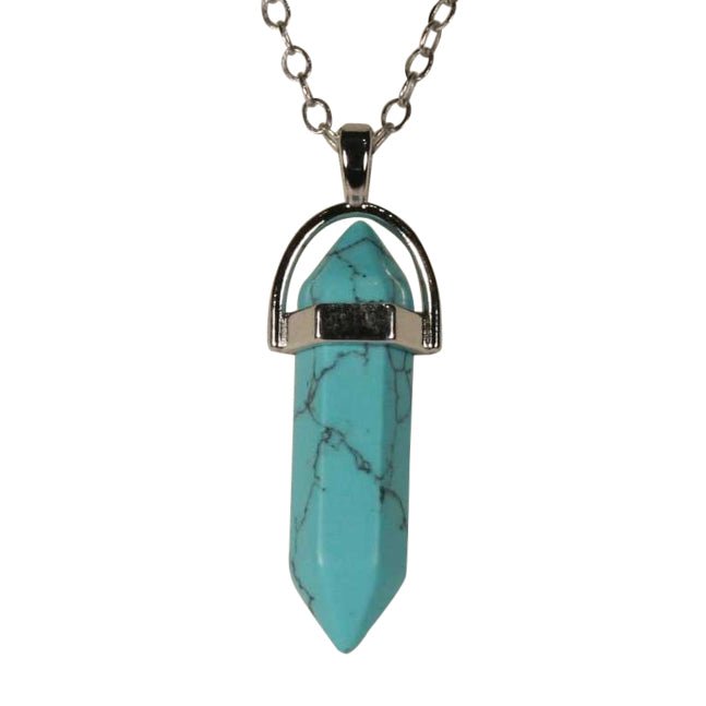 Dubbeleinder hanger van de edelsteen Turkoois in een zilverkleurige houder. De punten aan weerszijden (dubbeleinder) zorgen er voor dat de energie en de werking van de steen aan beide kanten wordt verspreid en/of ontvangen.