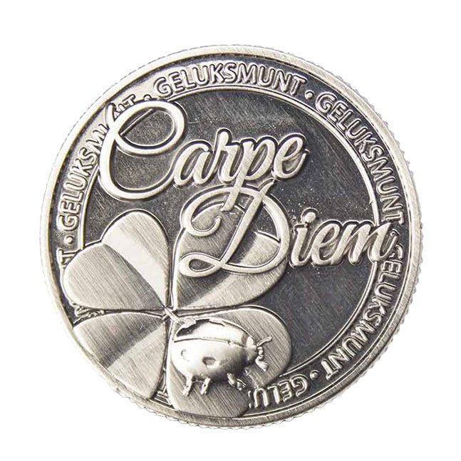 Op de achterzijde van de geluksmunt staat de persoonlijke tekst: "Pluk de dag"