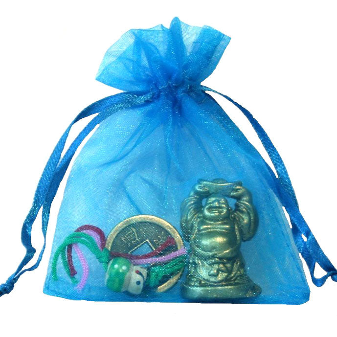 De gelukszakjes Boeddha bestaan uit een basic organza zakje, een mini Boeddha, een Chinees gelukspoppetje en een geluksmuntje.