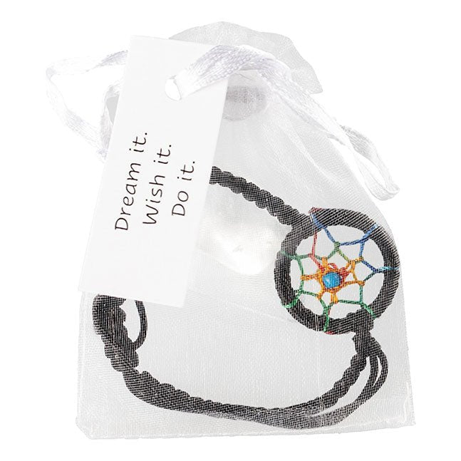 In het gelukszakje zit een armbandje dromenvanger en een kaartje. De dromenvanger wordt geleverd in 4 verschillende kleuren (paars, fel roze, rood, zwart).
