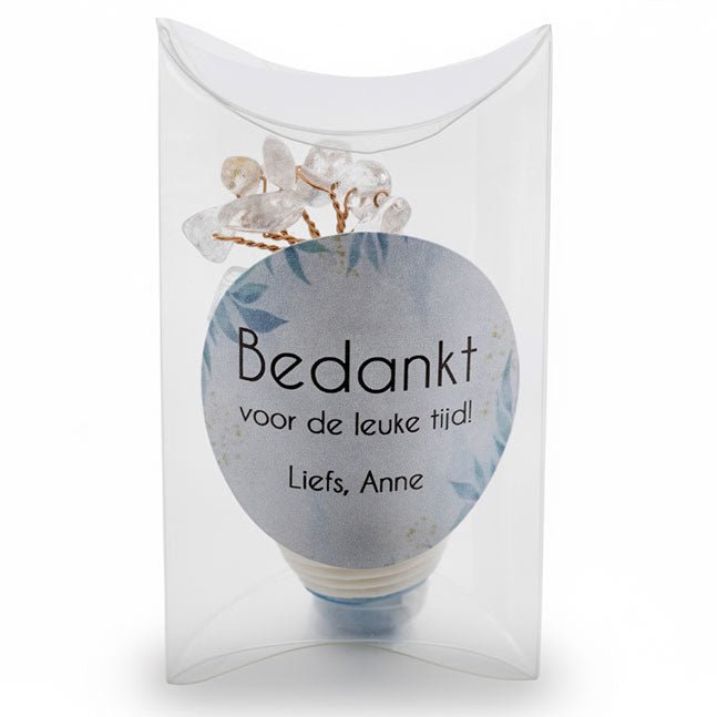 In het luxe doosje bevindt zich een prachtig, handgemaakt geluksboompje met kleine edelsteentjes. Dit boompje (ook wel een Tree of Life genoemd) symboliseert niet alleen de tijd die achter jullie ligt, maar wenst de ontvanger ook alle geluk en groei toe voor de toekomst.