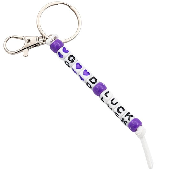 • Inhoud: sleutelhanger met letterkraaltjes good luck en paarse gelukskraaltjes