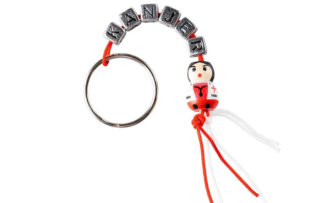 De sleutelhanger heeft zilveren letterkraaltjes met het woord KANJER.