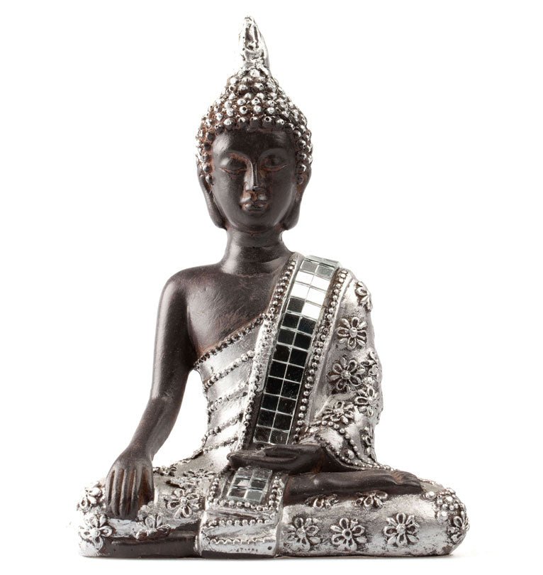 Deze zwart met zilveren Boeddha heeft spiegeltjes als versiering. De Boeddha Bhumisparsha wordt altijd zittend afgebeeld, met de rechterhand rustend op de knie en vingers wijzend naar de aarde.