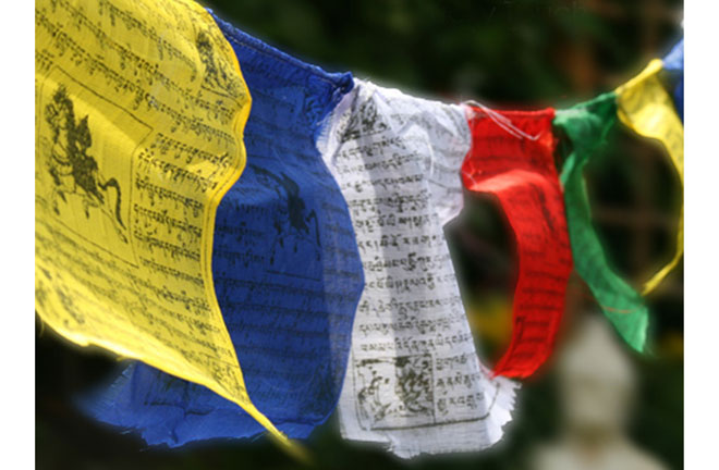 De 5 kleuren van de vlaggetjes staan voor de vijf elementen: