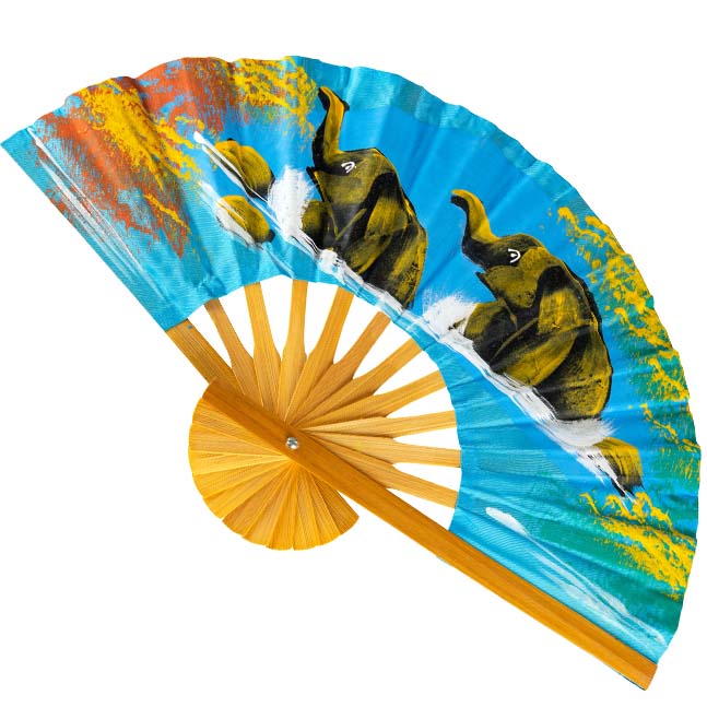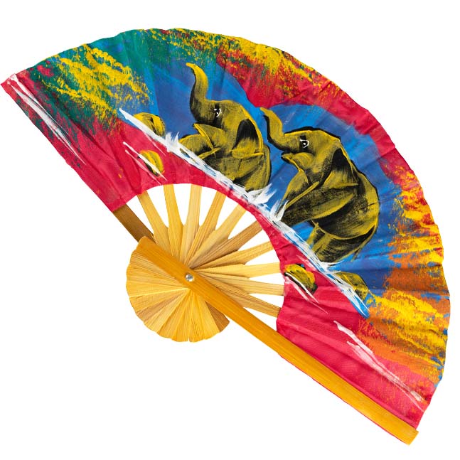 Mooie handwaaiers van hout met Olifanten erop in verschillende kleuren. De waaiers zijn hand geschilderd op een stoffen papier. De kleuren worden random geleverd.