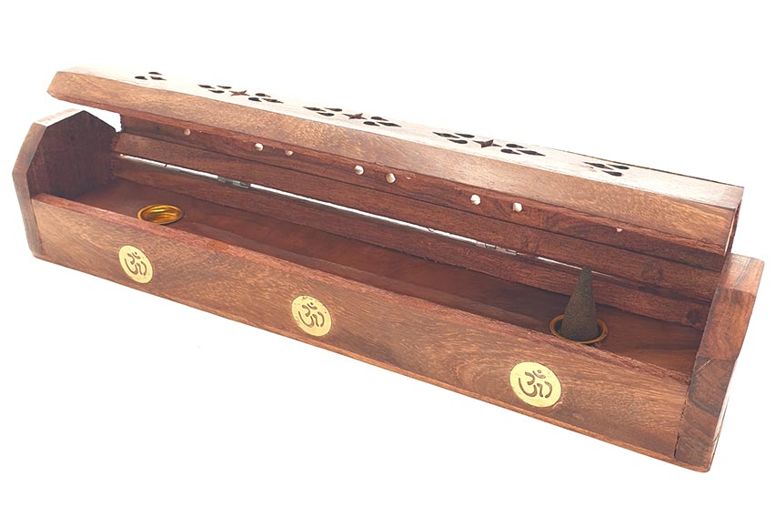 In de wierookdoos kun je een wierookstokje of 2 wierookkegels branden. Het wierookstokje kan je aan de binnenzijde van het kistje erin steken en voor de kegeltjes zijn er 2 uitsparingen waarin je de kegeltjes kan plaatsen.